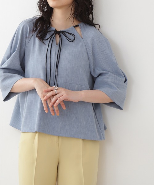 ドローストリングで夏らしい抜け感を作る半そでブラウス。襟ぐりのカットラインや袖山のタックデザインなど、一枚でデザイン性をプラスされたアイテム。ブラックカラーのドローストリングがアクセントとなり、引き締めにもひと役。身頃はゆとりのあるシルエット、裾をOUTしてハーフパンツ合わせがおすすめです。**********************透け感:なし裏地:なし伸縮性:なし光沢感:なし生地の厚さ:普通**********************
