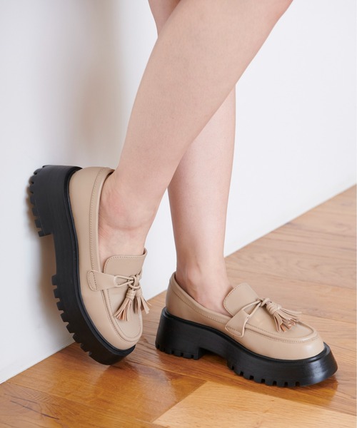 今年らしい重厚感のあるタッセル付ローファー。ほどよい高さのあるボリュームソールと甲のタッセルデザインがポイント。天候を気にしないで履ける合皮素材を使用しています。カジュアルからフェミニンなコーディネートまで幅広く合わせられる一足です。