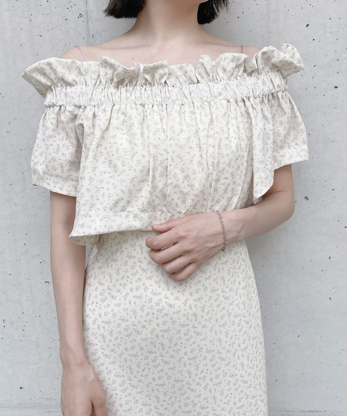 ◆小花柄がガーリーオフショルブラウスさりげない花柄がフェミンンな印象の一枚。デコルテ部分にはゴムが入っているので調整が可能です。また裏地の裾にもゴムが入ってるのでホールド感があり、安心して着られるデザインです。短丈なのでハイウエストのボトムとの合わせが◎お揃いのワンピースとのセットアップコーディネートもおすすめです。裏地あり