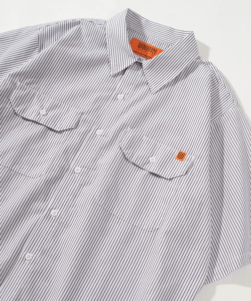 【UNIVERSAL OVERALL/ユニバーサルオーバーオール】ビッグシルエット ワンポイント ツイルワークストライプシャツ/半袖シャツ/【M~XXL対応】ブランドヒストリー■【UNIVERSAL OVERALL/ユニバーサルオーバーオール】1924年に創業したアメリカ、シカゴのワークウェアブランド、ユニバーサルオーバーオール。ハードでリーズナブルなアイテムを、ほぼ1世紀近くに渡り拘って追求し続けている。現在でも、アメリカでは数少ないリアルワークウェアとして、多くのワーカーたちに支持されている。■おすすめPointさらりと柔らかな質感で程よい厚みを提供してくれるポリエステルツイル素材を採用。生地にハリがありつつ、さらっとすっきり着用出来、着心地も良い事でレイヤードスタイルにもマッチする年間で着用可能なワークシャツ。素肌に着ても心地良く、ちょっとしたお出掛け時のワンマイルウェアとしてや、ビッグシルエットを活かしてのシャツアウターとしても使い勝手が良いアイテム◎ワークシャツの特徴であ大き目のフラップポケットを左右に配置したデザインに、左ポケットにはブランドタグをアクセントで配置。ユニバーサルオーバーオールアイテムの定番になりつつあるワークツイルシャツは、ワークウエアの武骨さを残しつつ、どんな時代のトレンドにも対応できるシンプルなデザインとファブリックは多くのアイテムとの相性抜群の1枚。ストライプのカラーリングも3種類あり色違いでも欲しくなる1枚。ボックスタイプのワイドなシルエットが今っぽいオーバーサイズの着こなしにピッタリです。1枚ではもちろん、ジャケット、アウターなどのインナーとしても◎■着合わせPointインナーに半袖T、モックネックT、グラフィックT、パーカー、ラグラン、カレッジロゴ、タンクなどのアイテムにオーバーサイズでルーズな着こなしが、今一番のおすすめ着合わせ。ボトムスにワイドパンツなど全体的にゆったりとしたコーデもおすすめです。同色のボトムを合わせてセットアップスタイルも◎定番のワークシャツですので、大人っぽい気分の日はフレアパンツ、ワイドパンツ、スキニーなどのシンプルボトムとの組み合わせも◎またカーゴパンツ、ペインターパンツ、オーバーオールなどとのワークテイストアイテムとの組み合わせも良いです。カバーオールやデニムジャケット、ナイロンジャケットのインナーに合わせてもかわいいです。メンズ、レディース問わず着用いただけるユニセックスなデザインは、女の子もマーメイドスカートやシフォンスカート、ワイドパンツ、サロペットなどとの相性も抜群でカップルコーデやお友達とのペアコーデなどもおすすめです。これからの季節はショートパンツ、ハーフパンツ、イージーパンツ、ジョガーパンツなどの丈物アイテムにスニーカー、スポーツサンダルを合わせたコーデにも最適◎小物に巾着バッグ、サコッシュ ショルダーバック バケットハット ワークキャップ ワッチキャップ コーデュロイ小物などと合わせればストリート感、アクセサリーのネックレス リング ピアスなどを合わせてコーデすると大人カジュアル感など小物により多くの演出もできます。大切な人へのプレゼントとしてもおススメのアイテムです。■お買い物をお楽しみ頂くために◎購入ボタン横のハートマークをクリック!完売カラーの再入荷通知、ラスト1点の通知、セールの通知も受け取ることができます(商品のお気に入り登録)◎ショップのトップページにあるハートマーク【お気に入りショップに追加】をクリック!新商品の入荷や再入荷等、いち早くブランドのお得な情報を受け取ることができます(ブランドのお気に入り登録)【make a ray!/メイクアレイ!】スタンダードなオリジナルアイテムとストリートから発信される旬なブランドをセレクション。時代の「今」を切り取り「旬」なトレンドをミックス。日常のファッションに都会的な要素が溶け込むアイテムをプチプライスで提案するセレクトショップです。