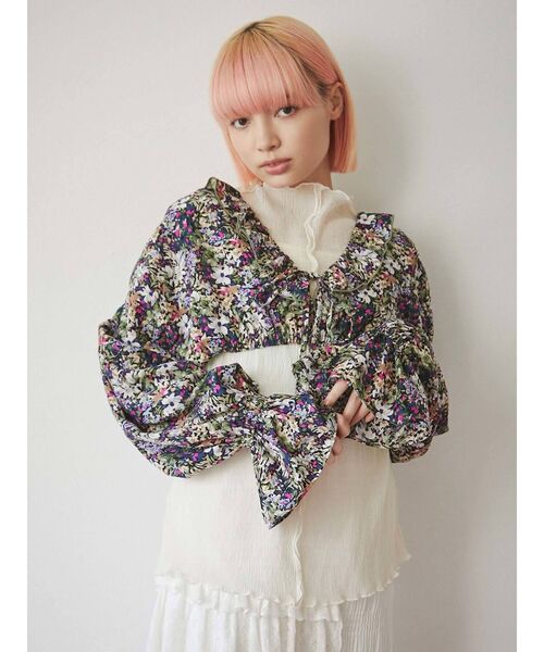 ※商品は、サイズ感が少し大きくなります。 〇 LOOK use ITEM 〇 庭園に咲く花たちのような、 鮮やかなショート丈のブラウスです。 少しdarkな色合いの花柄で、 甘くなりすぎず、 大人feminineにも、 casualにも振れる itemです。 ざっくりと深くあいた襟元には、 フリルやリボンを添えました。 キャミソールやTシャツを合わせて 夏→秋へのシフトstylingに ぴったり。 肌寒い時期には、 タートルニットやワンピースに合わせ アクセサリー感覚で組み合わせても〇