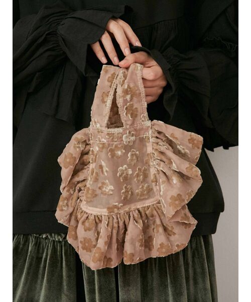 〇 LOOK use ITEM 〇つややかなオパールベロアと、愛らしいお花柄の組み合わせがキッチュで愛らしいitemです。ちいちゃな ミニサイズのトートbagは、たっぷりフリルがお魚のようにふわふわ。必要最低限の 荷物を入れて、ミニマムに、アクセサリー感覚に。