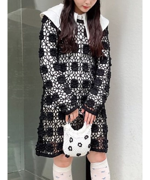 〇 LOOK use ITEM 〇ぽこぽこと、シックに並ぶお花たちがアンニュイな表情のニットワンピース。ざくざくと編みたて、カットソーやキャミソールなどとのレイヤードが楽しめるitemです。