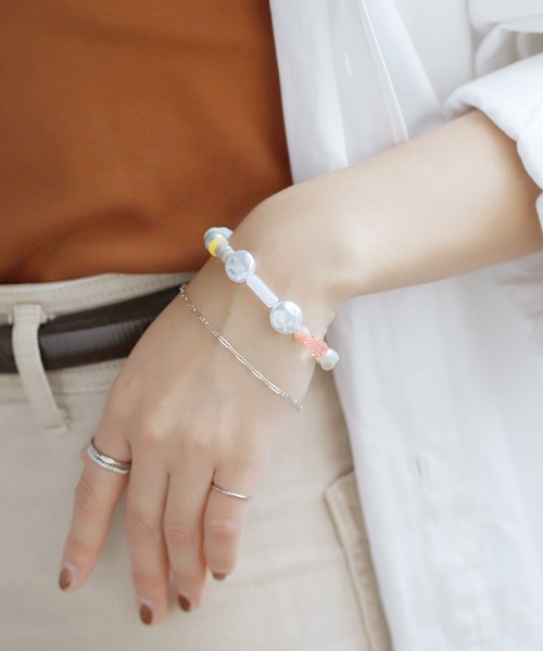 鮮やかなカラービーズが、手元に華やぎを与えてくれるブレスレット。シンプルなコーディネートにプラスするだけで、ワンランク上のコーデに仕上がります。棒状の金具を丸輪に通すだけなので、簡単に着けられるのも嬉しいポイント♪※ATTENTION※■製造・輸送時についた微細なキズや、欠け、バリ(型抜きの際に生じる凹凸)が見られる場合がございます。■ビーズの柄や配置には個体差がございます。上記は不良の対象外となりますので、予めご了承くださいませ。■引っかかりなどによる破損にご注意ください。■バーコードと商品名が異なる場合がございます。正しくは「マルチビーズマンテルブレスレット」です。