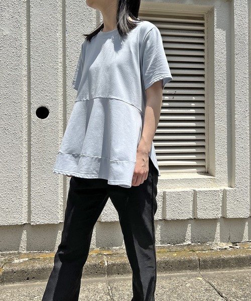☆フレアがかわいいゆったりTシャツ☆ウエストからフレアの切り替えが入ったデザインTシャツです♪フレアにはカーブのスリットを入れ動きとアクセントをプラス。着た時のシルエットをきれいにみせてくれます♪肩幅はオーバーにせず、きちんと感もあります。きれいめな印象も漂う大人なリラックスTシャツです♪☆デイリーに活躍☆これからの季節に嬉しいTシャツアイテム。デザインがありながらシンプルにまとまっているのでデイリー使いしやすいのが魅力です♪デニムパンツやゆったりとしたワイドパンツ、タイトスカートからフレアスカートまでボトムを問わず相性がいい優秀アイテム♪カジュアルになりすぎないのできれいめに着こなしたい方にもおすすめの一枚です。☆着心地のいいカット素材☆しなやかで肌触りいい素材です♪薄手なので着心地も◎ベーシックに使いやすいホワイト、ブラックと明るいトーンのベージュとさわやかなブルーの4色展開です。※淡色は透け感があります。 インナーには同色かヌードカラーをご着用ください。【原産国】 中国