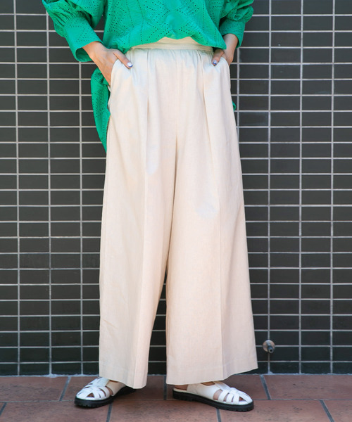 【シーズンスタイルにマストなリネンパンツ】夏に嬉しい素材で仕上げたシーズンライクなワイドパンツ。イージーな穿き心地ながらもサイドタックを施したことで腰回りをすっきり見せ、自然とメリハリのあるスタイリングを完成させます。トレンドに左右されることなく、ワードローブにあると頼れる1本。定番のBLACK&L.BEIGE、スタイリングのポイントになるLAVENDERの3色展開です。POINT・夏に快適な素材感・体型カバーを叶えるワイドシルエット・飽きのこないベーシックなデザインCOORDINATE女性らしく着こなすならコンパクトなトップス合わせをぜひ。足元はサンダルで抜け感をプラスしていただくのがおすすめです。※この商品は、着用時の摩擦やクリーニングの繰り返しにより、白化、羽毛立ちや部分的な脱色が起こる場合があります。※素材の表面のネップ(部分的に太くなっている)やスラブ(太さにムラがある)などの糸ムラは、麻の素朴な特徴を生かしたものです。※その他お取り扱いに関しましては、商品に付属のアテンションタグをご覧ください。※商品画像は、光の当たり具合やパソコンなどの閲覧環境により、実際の色味と異なって見える場合がございます。予めご了承ください。※商品の色味の目安は、商品単体の画像をご参照ください。▼お気に入り登録のおすすめ▼お気に入り登録商品は、マイページにて現在の価格情報や在庫状況の確認が可能です。お買い物リストの管理に是非ご利用下さい。-----------------------------透け感:ややあり伸縮性:なし裏地:なし光沢:なしポケット:あり-----------------------------