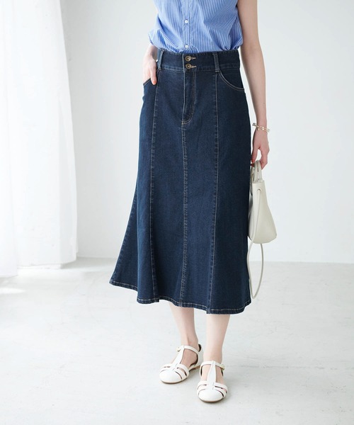 お腹まわりのすっきり見えを叶えたデニムスカート。 【素材感】 ・フラットな表面感のストレッチデニムを使用。 【デザイン・シルエット】 ・ウエストベルト下に太巾のゴムを入れることで、下腹を着圧し細見えに期待。 ・ハイライズタイプのレトロなロングデニムスカート。 【カラー】 ・ブラック、インディゴブルーの2色展開。 【スタイリングポイント】 ・ボリュームトップスをインするか、タイトなトップスを合わせるのがおすすめ。 ・トレンドの厚底シューズとも相性抜群。 ----------------------------- 裏地:なし 透け感:なし 伸縮性:ややあり 生地感・厚さ:普通 ポケット:あり その他仕様:ウエストの内側にはゴムが入っています。 季節:通年 ----------------------------- ※撮影時の光、お使いのモニター環境によって色の見え方が違う場合がございます。 ※モデル身長:165cm 着用サイズ:38