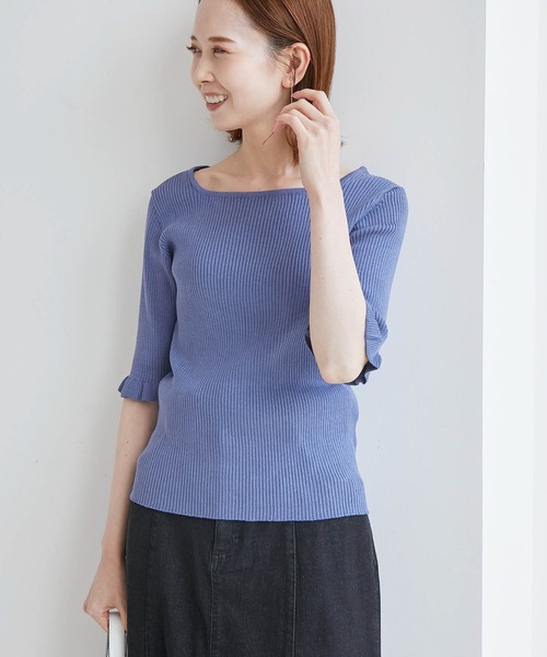 さりげないフリルが好感度大。袖丈や着丈まで計算された優秀ニット。【素材感】・環境に配慮したサステナブルなアイテム。・肌触りの良いオーガニックコットンを使用。・チクチク感のない柔らかな生地感。【デザイン・シルエット】・コンパクトなシルエットと、すっきり開くスクエアネックが女性らしいニット。・袖は安心の5分丈で、袖口をフリル使いにしたのがポイント。【カラー】・ベーシックカラーとポイントカラーを交えた、豊富な5色で展開。【スタイリングポイント】・シンプルで合わせやすく、存在感のある柄物スカートとベストマッチ。・キャミソールワンピースや、サロペットのインナーにも◎。-----------------------------裏地:なし透け感:ライトグレー(08)はややあり、その他はなし伸縮性:あり生地感・厚さ:やや薄手季節:春~初秋-----------------------------※撮影時の光、お使いのモニター環境によって色の見え方が違う場合がございます。※モデル身長:165cm 着用サイズ:38:【スタッフ着用レビュー/サイズ感】・身長151cm (普段の着用サイズ:36 着用サイズ:38)どちらかというとタイトめな印象ですが、柔らかい生地なので窮屈感などは感じなかったです。スクエアネックになっているので鎖骨がきれいに見え、女性らしさが際立ちます◎袖は肘が隠れる長さで腕を出したくない方にもおすすめ!着丈は腰上くらいまであり、インスタイルでもアウトスタイルでも着回しがききます。・身長167cm (普段の着用サイズ:38 着用サイズ:38)コンパクトなサイズ感ですが、とても伸びの良いニットなので窮屈感はないと思います。デコルテも品の良い開き具合で下着のラインなど気にせず着ていただけます。