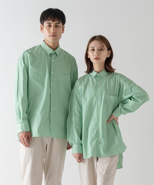 リラックスバックプリーツシャツ<グリーンストライプ>