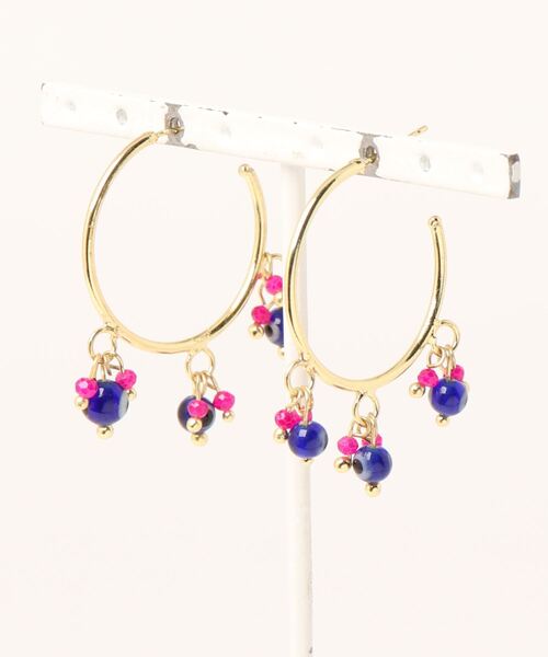 - TRAVELER - Exotic Modeエキゾチックな魅惑の世界感をあなたに。他人の邪悪な視線や嫉妬から身を守るトルコのお守り「ナザール・ボンジュウ」をイメージした、ブルーのガラスビーズが揺れるフープピアス。青は生命の源であり、魔を払うとされています。顔まわりを明るく華やかに彩ります。※こちらの商品は1点1点職人による手作りとなります。その為、形や色合い・模様など若干異なる場合がございます。あらかじめご了承ください。Amina Collection Co.,LTD.