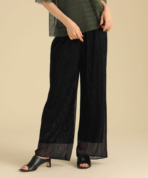 1枚でどんなコーデにもハマるシアー感のある繊細なラメ入り素材に細かいプリーツ加工を施した柔らかな生地を使用したパンツ。ウエストはゴム仕様でラクに履く事が出来ながらもトレンド感のある1枚です。繊細なラメのキラキラが魅力的◎。オーバーサイズのTシャツでカジュアルに着るのはもちろん、ブラウスと合わせ綺麗めにも合わせられる万能なアイテムです【BLACK】Model:H170 B79 W59 H86 Size:1【GOLD】Model:H166 B76 W54 H85 Size:1生地の厚さ:普通透け感:あり伸縮性:ややあり光沢感:あり裏地:あり【スタッフレビュー】スタッフ:kawa-kami身長:155cm / 普段サイズ:S / 着用サイズ:0サイズ感: ウエストゴムでストレスフリーな着心地。素材感: ラメ素材でコーディネートに幅が出来るアイテム。裏地付きでチクチクしないのも◎ポイント: 一枚でもレギンス使いでも着用できる万能アイテム!シワが気になりづらいので遠出にも◎