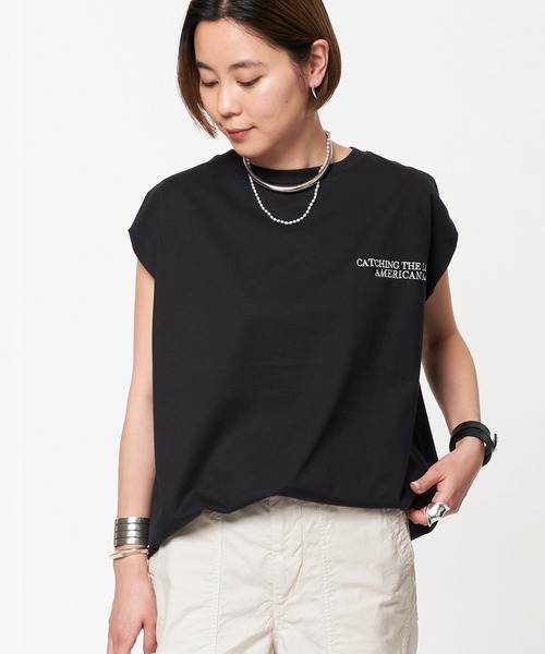 さりげなく入る胸の刺繍がアクセントになるAMERICANAのエンブロイダリーTシャツ。少し肩にかかるノースリーブのデザインで、肌見せしすぎない上品なデザインが特徴的です。豊富なカラバリはどれもワードローブに馴染みやすく使い勝手が良いので、スカートやスラックス、デニムなど様々なボトムでコーディネートを楽しみたい1着です。*********************透け感:ホワイトのみややあり裏地:なし伸縮性: あり光沢感: なし生地の厚さ:普通*********************【スタッフ着用コメント】《STAFF.E》30代後半/身長:164cm/体型:普通/普段サイズ:M/着用サイズ:フリーサイズ感:程よくゆったりとしたサイズ感。素材感:ややハリのあるさらりとした素材。着心地:ヒップを覆う丈で安心感があります。 肩が少し隠れる袖丈ですっきりと着て頂けます。*********************【AMERICANA/アメリカーナ】ブランドコンセプトは「少し、はずす為の1アイテム」。デザインソースはスポーツ・ミリタリー・ワーク等の定番アイテムであり、メンズウェアをレディースウェアのバランスで作り、いかに面白いバランスに変化させるかをポイントとした、新しいスタンダードを目指している。※取り扱いについては、商品についている洗濯表示にてご確認下さい。※店頭・外での撮影画像は、光の当たり具合で色味が違って見える場合があります。商品の色味は、スタジオ撮影の画像をご参照ください。※メーカー品番:BRF-601A/1※カラーについて弊社販売カラー名:メーカーカラー名ブラック(001):ブラックホワイト(010):ホワイトカーキ(036):オリーブサックスブルー B(049)LTサックス店舗へお問い合わせの際は下記商品名・品番をお伝えください。商品名:AMERICANA embroidery T品番:22070587002510問い合わせ店舗 :AP STUDIO 新宿店・横浜店・大阪店【注意事項】・画像の商品はサンプルです。実際の商品と仕様、加工が若干異なる場合があります。・サイズ表記はあくまで目安となります。洗濯:洗濯機使用可(ネット使用)
