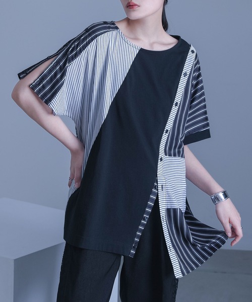 ■デザイン ランダムな切り替えデザインと3種類の生地を組み合わせた異素材使いがモードな雰囲気を作り出す、表情豊かなデザインTシャツ。 左肩、右袖、裾はボタンの開閉によってシルエットや肌見せの調整が可能で、その日の気分に合わせて着こなしのアレンジを楽しめます。 肩や袖、裾のボタンを開けることで、さり気ない肌見せと大人の抜け感をプラス。 前身頃の前立て部分は下側もストライプの切り替えデザインでアクセントに。 アシンメトリーなヘムラインが、他にはないこなれ印象に仕立てます。 左右で異なる袖デザインや、後ろ身頃の切り替えデザインなど、360°どこから見ても洗練されたモードな印象を与えます。 ■コーディネート デザイン性がありながらもモノトーンでまとめており、様々なアイテムと合わせてご着用いただけます。 デザイン性のあるボトムスや同系色のボトムスと合わせることでこなれた印象に、シンプルなボトムスと合わせることで洗練されたモードな印象が完成します。 ■素材 優しい肌触りコットン100%素材を使用したカットソー生地と、細めのストライプ柄で魅せるコットン100%素材のシャツ生地、綺麗めな印象が叶うストライプ柄のスーツ生地の3種類の異素材生地をドッキング。程よく薄手な生地感で、暑さを感じる時期の着用に最適です。