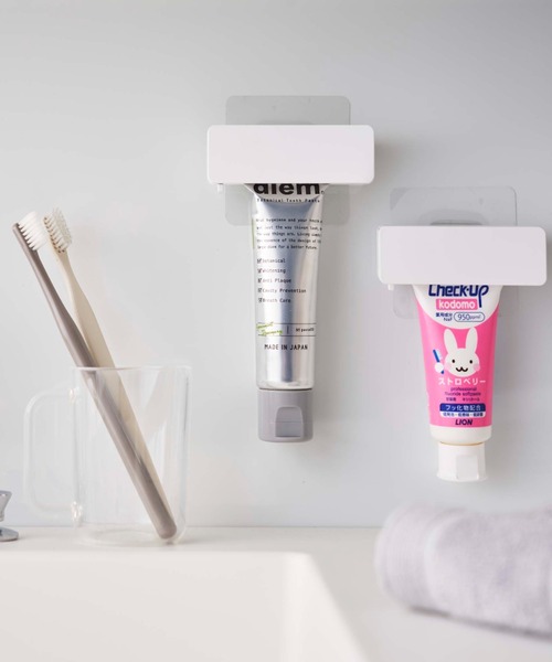 歯磨き粉チューブを浮かせて収納。ハンドルを回してチューブの中身がきれいに絞り出せます。 浮かせて収納できるので、歯磨き粉チューブがぬめらず衛生的です。 ハンドルを回して最後まで無駄なく使えます。 自立するので立てて置くことも可能。蓋を外してスライドすれば、簡単に取り出せます。 ■取り付け可能な壁面 フィルムフック:光沢のある平らな油染みしない面(フィルムフックの接着面よりも大きい面・タイル・プラスチック面・ステンレス・冷蔵庫や洗濯機などの金属塗装面) 【サイズ】 約幅9㎝X奥行3.5㎝X高さ3.5㎝ (壁面収納時) 約幅9㎝X奥行4㎝X高さ7㎝ 【重量】 約60g 【耐荷重】 約250g 【耐熱】 チューブホルダー:90℃ フィルムフック:60℃
