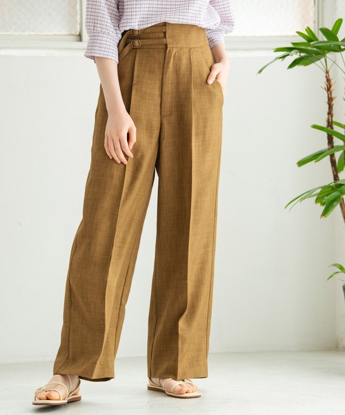2連のデザインベルトが目を惹くストレートパンツ。 センタープレスの縦ラインですっきり見せを叶えます。 脚のラインを拾わないゆったりとしたシルエット。 股上深めのハイウエストデザインでスタイルアップ効果があるのも嬉しいポイントです。 シャツやブラウスとのきれいめスタイルはもちろん、 Tシャツを合わせカジュアルダウンさせた着こなしもおすすめです。 バックウエストはゴム仕様でリラクシーな穿き心地が叶います。 ポケット付きで実用性も◎ シーズンムード高まるナチュラルな素材感。 さらっとした肌触りで快適に穿いていただけます。 - - - - - - - - - - - - - - - - - - - - - - - - - - - - - - - - - 透け感:なし 裏地:あり 伸縮性:なし 光沢感:なし - - - - - - - - - - - - - - - - - - - - - - - - - - - - - - - - - ※ 撮影時の照明などの環境と、モニターに表示される色味がメーカーにより変わってしまう等の理由により、実際にお届けする商品と、ご覧になられているアイテムの色が若干異なる場合がございます。ご了承下さいませ。