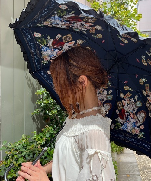 【アイテム説明】 人気のアンジェリークスピカのヘイメルアリス柄の晴雨兼用傘です。 外側は黒の遮光生地でしっかり紫外線をガードしつつ、内側には華やかで上品な柄をプリントしました。 雨の日も傘の中が暗くならず、外側は単色なので服装を気にせず持ち歩けます。 傘の端にはフリルをプラスして、閉じている時もワンポイントあるデザインです。スリムな持ち手でかさばらないのも◎。 エレガントなパゴダ型でたたずまいも上品な印象に。