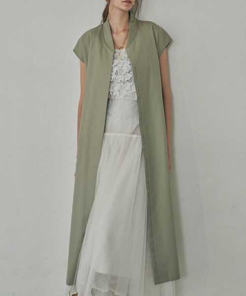 人気なデザインベストが素材、カラーをスプリング仕様にディティールチェンジ。 ▽デザインポイント 前を閉じてワンピースに、開けると羽織としてさまざまな着こなしが楽しめます。 インナーを変えればオールシーズン使えて便利な1枚。 春らしいベージュ、ライトグリーン。モードなブラックの3色展開です。 ▽ディティール 二の腕にかかるハーフスリーブで 夏はノースリーブやTシャツにレイヤードしても◎ ホックで止めるタイプなので着脱もしやすくサラッときれいめな印象に。 サイドにはポケット付で実用性を兼ね備えたデザインです。 ********************* 透け感:なし 生地の厚さ:薄手 裏地:なし 伸縮性:なし ********************* 【サイズ補足】 着丈ネックポイント~125cm 身幅50cm 裾幅96cm 肩幅37cm 袖丈9cm 衿幅4.5cm 前下り14cm ■商品のお気に入り登録 再入荷の通知や、ラスト1点の通知、セールの通知がいち早く届きます! ■ブランドのお気に入り登録 新商品や再入荷など、いち早くブランドのお得情報が届きます!