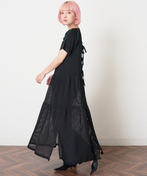 ◆着映えすること間違いなしのティアードワンピ―ス◆ ■デザイン メッシュ素材を使用したティアードワンピ―ス。 前後2WAY着用が可能です。 気分やお好みに応じて着用方法をお選びいただけます。 身頃に施された3列のレースアップが華やかさをプラスし より上品な印象に仕上げてくれます。 脇裾には深めのスリットが施され、足さばきも スムーズなのが嬉しいポイント。 ■スタイリング キャミソールやカットソーの上からお召いただくことで こなれ感を演出できます。 合わせるボトムは、同素材を使用した (A1HGP32072)または(A1LGP27072)と合わせていただくことで、 まとまりのあるスタイリングに仕上がります。 …………………… 透け感:あり 厚さ:薄手 伸縮性:なし ……………………