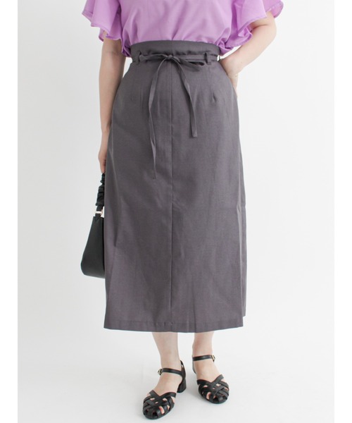 リネン混で仕立てた爽やかなセミタイトスカート。 しっかりとハリ感のあるAラインシルエットが大人上品に魅せ、美脚も叶えてくれる優れもの◎リボンベルトで可愛らしいアクセントを添えたウエストはゴム仕様で締め付け感もなし! トップスインのすっきりコーデで、脚長効果も狙えます。 ※商品画像は、撮影環境やお客様のご利用のPC・スマートフォンのモニター環境などにより実物と色味に差異がある場合がございます。 【その他採寸】 F ウエスト:[後ゴム仕様] 64cm