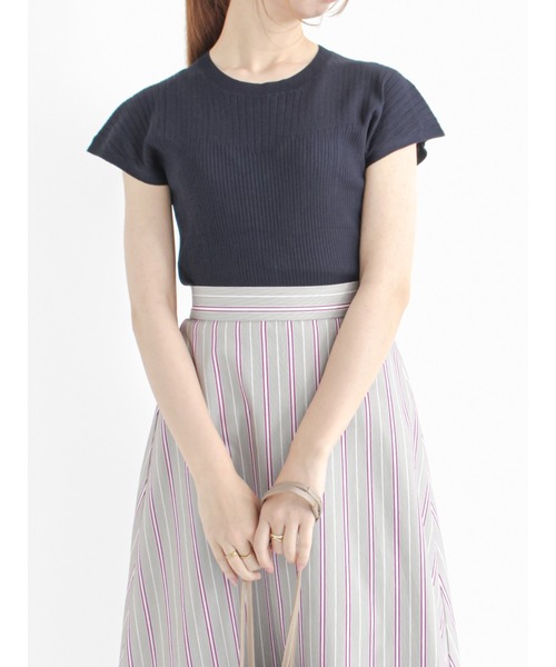 露出を控えたフレンチスリーブで、上品で大人っぽく仕上げたニット。伸縮性のあるリブ地で動きやすく、程よくフィット感のあるシルエットでぐっと女性らしい印象に。カジュアルからキレイめコーデにと、オンオフ幅広く活躍してくれるワードローブの頼れる味方です。
