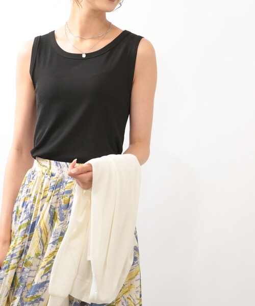 【デザイン】ニュアンス感のある、メランジ調に仕上げたタンクトップです。伸縮性の高いリブ編みで、着心地の良さが魅力です。バランスの良いネックラインが、デコルテを綺麗に見せてくれます。触れた瞬間ひんやりする接触冷感素材を使用しているので、暑くなるこれからのシーズンにおすすめです。【生地感】絶妙な薄さでサラッとしていて触れるとひんやりとする生地を使用。※こちらの商品はやや透け感があるため、インナーの着用をおすすめします。※製品寸法は平置きのスペックとなっております。こちらの商品は伸縮性があります。モデル情報:身長168cm B78 W58 H84 着用サイズ:02(M)店舗へのお問い合わせ商品番号:741-14363●製品寸法:02(M):総丈58cm B78cm 肩幅31cm03(L):総丈59cm B82cm 肩幅31cm備考:
