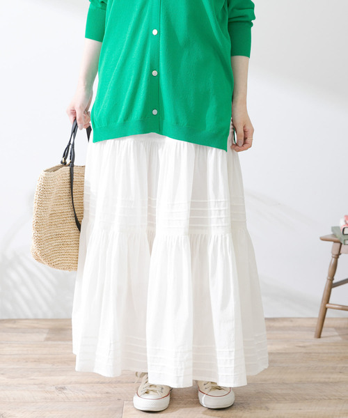 【今季トレンドのティアードピンタックのスカートが登場】 インド生産特有の、柔らかでエアリーな風合いが魅力のコットン素材をたっぷりと使用したスカート。 切り替えデザインで、腰回りは出来るだけすっきりと、裾に向かってふんわり広がる女性らしいシルエットに。 細やかなピンタックを入れることで、カジュアルながら華やかな印象にしてくれる一着です。 裏地にもコットン素材を採用し、貼りつき感がなく暑い真夏にも快適にお召しいただけます。 ※現在の染色技術では、自然光や照明などにより、通常の使用でも若干の変退色は避けられません。ご了承ください。 ※この商品はインドで生産されたものです。手作業による温かみのある独特の風合いをお楽しみください。生地の織りむら、多少のプリントのズレは商品の特徴のひとつです。ご了承ください。 ※その他お取り扱いに関しましては、商品に付属のアテンションタグをご覧ください。 ※商品画像は、光の当たり具合やパソコンなどの閲覧環境により、実際の色味と異なって見える場合がございます。予めご了承ください。 ※商品の色味の目安は、商品単体の画像をご参照ください。 ----------------------------- 透け感:なし 伸縮性:なし 裏地:あり 光沢:なし ポケット:なし -----------------------------