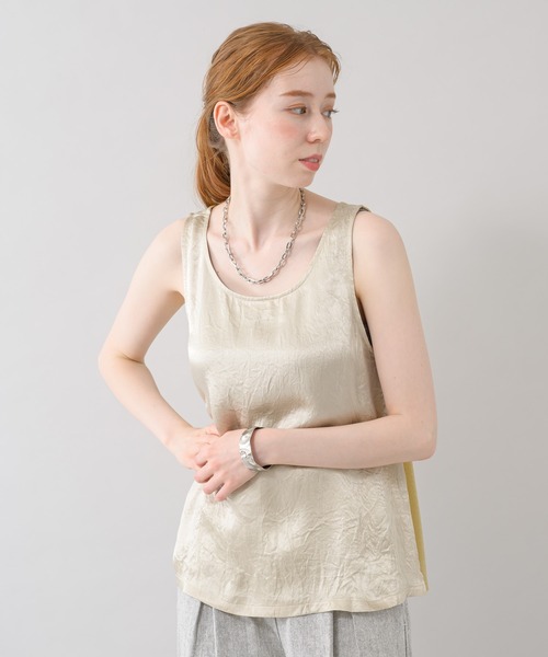 大粒のラメが夏らしいラメタンクが入荷しました。 ○POINT ・前面はラメ、背面はしわ加工が施された光沢のタンクトップ。 ・Aラインシルエットにサイドスリットで、通常のインナーとしてはもちろんジャケットやカーディガンにインするのもおすすめです。 ・背面に使用しているアセテートは汚れにくい、汚れても落ちやすいといった特徴を持っており、夏にぴったりの素材です。 ○STYLING ・シアーシャツにインすれば程良い光沢で夏らしい爽やかな印象に。 裏地:なし 光沢:あり 伸縮性:あり 透け感:あり 生地の厚さ:普通 ポケット:なし 【cloche】 ”可愛くお洒落に”に応える、よりリアルな大人可愛いアイテムを提案します。
