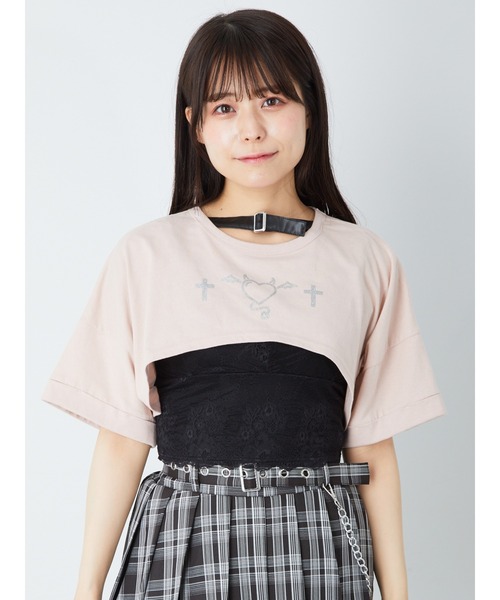 フロントにONされたデビルハートが可愛いアクセントになって、ゴシックな魅力を高めるトップスの登場です♪ 大胆なクロップド丈で、旬なレイヤードスタイルをメイク◎ インナーが映えて、スタイリングを楽しめます。スリーブは、5分丈で、抜け感を与えながら、華奢なアームラインをアピール! 首元のベルトが、ちょっぴりクールな雰囲気をプラスしてくれます☆