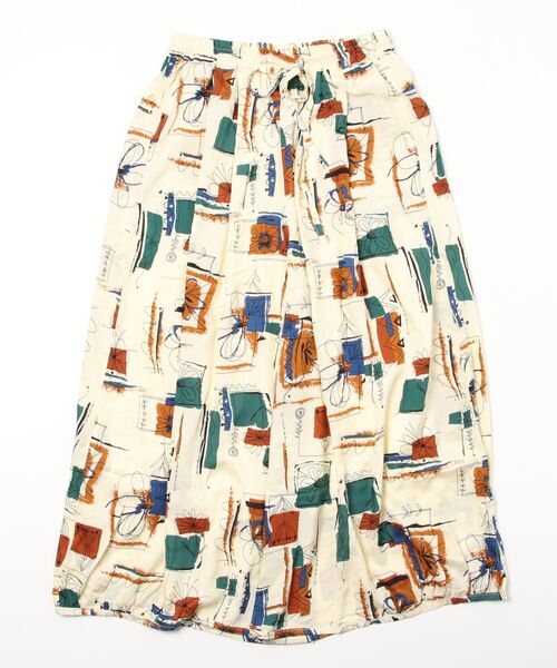 子供の落書きのようなプリントが個性的なギャザーワイドパンツ。ゆったりワイドなシルエットとウエストゴム仕様で、さらっと楽に着こなせます。暑い季節にぴったりな、ポップな柄が気分を上げてくれるアイテムです。
