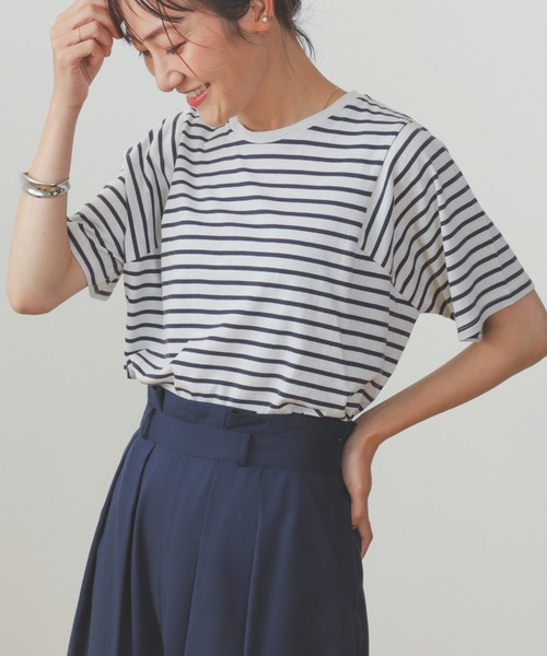 定番ボーダーがアップグレード♪変形アームホールの切り替えが特徴的なボーダーTシャツ。先染めカットソーにケミカルウォッシュ加工を施すことで、ヴィンテージライクな風合いに仕上げました。シンプルにデニムはもちろん、あえてガーリーなフレアスカートなどとも相性◎。キャミワンピースやジャンパースカートのインナーとしても重宝する、着回し力抜群の1枚です。STAFFModel:H158(cm) Size:FREE