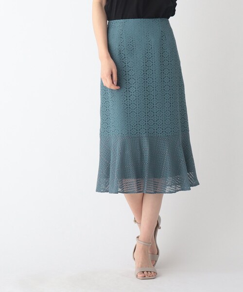 パターンドッキングが華やかなレースマーメイドスカート 【デザイン】 2種類のレースを裾切替えでドッキングしたマーメイドスカート。 裾柄の合わせを正取りし、すっきりときれいなシルエットに。 レース特有の透け感が気にならない、きれいなカラー展開です。 ※ポケットなし 【素材】 綿(コットン)混のさらっとした幾何学柄レースを2種類使用。 同色系の裏地付きで一枚で着用して頂けます。 軽やかな印象の夏にぴったりな素材感。 マシンウォッシャブルなのでご自宅のお手入れもらくちん。 ※裏地あり 【こだわり】 品よく華やぐ長めのひざ下丈でサンダル合わせにも◎。 気温が上がっていくこれからの季節に、カットソーやブラウスを合わせてもスタイリングポイントになります。 ※36(S)・42(LL)サイズはWEB限定サイズ こちらの商品は主に夏に着用いただける商品です。 モデル情報:身長172cm B83 W59 H87 着用サイズ:38(M) 店舗へのお問い合わせ商品番号:C58-74033 ●製品寸法: 36(S):W62~64cm H90cm 総丈72cm 38(M):W64~66cm H92cm 総丈73cm 40(L):W67~69cm H94cm 総丈74cm 42(LL):W70~72cm H96cm 総丈75cm 備考: