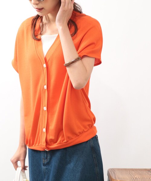 ■ポイント ・主役級のカーディガン! ・ゆるっとした着こなしがサマになる。 ・ボタンを閉めてトップス風にも◎ ・程良い透け感が涼しげでさらっと着用できる。 ■デザイン フライス素材のVネックカーディガンです。 羽織りとして着て頂くのは勿論、中にタンクトップを合わせてボタンを閉めてプルオーバー風に着て頂くのもおすすめです。 少し長めの着丈で、リラックス感のあるゆったりとしたシルエットです。 ■スタイリング 今期注目のカラーを取り入れるなら、 ボタンを閉めてトップス風に着るだけで着映えするオレンジとライトブルーがおすすめ。 少し襟を抜くように着るとこなれ感UP! タンクトップやTシャツ、ワンピースにサラッと羽織って、スタイリングを楽しんで◎ ■スタッフ着用コメント スタッフA 身長:150センチ 体型:普通 着用サイズ:F 低伸長の私はお尻がすっぽり隠れる丈でした。 涼しげでとっても使いやすいです。 スタッフB 身長:157センチ 体型: ふくよか 着用サイズ:F いつもLサイズを着ている私ですが、フリーサイズでゆったり着用できました。 お尻も隠せます。 ■生地、素材感 生地感:ドレープ性や伸縮性が高いレーヨン混素材。レーヨン85 ポリエステル12 ポリウレタン3% 透け感:あり 伸縮性:あり 厚さ:薄手 裏地:なし モデル情報:身長168cm B78 W58 H84 着用サイズ:00(FREE) 店舗へのお問い合わせ商品番号:741-15303 ●製品寸法: 00(FREE):着丈59cm B112cm 裄丈38cm 備考: