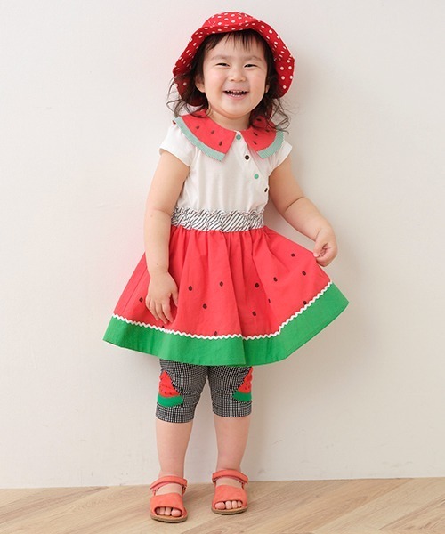 全体を使ってスイカを表現した個性あふれるスカートです。色彩豊かなメリハリデザインがコーデを可愛く彩ります。スイカの種プリントや果肉と皮の境目に添えたブレードでアクセントをプラス。総ゴム仕様のウエストにはフリルをつけており、トップスをインしたスタイリングもサマになります。【おすすめの着用時期は春夏シーズン】【透け感】透けない【生地の厚さ】普通【伸縮性】なし【裏地】あり【ポケット】なし【アジャスター】なし