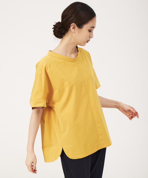 *Detail*機能性にも優れたタフタTブラウス。 表面にナチュラルな凹凸加工をした撥水素材なので、真夏でも涼しく雨の日でも安心して着ていただけます。 トレンドのTブラウス感覚で着られるベーシックさと女性らしいシルエットに拘りました。 襟を程よく立てたことで、立体感を持たせ肉感を拾いにくくし、サイドのスリットが抜け感をプラス。 手洗いも可能な嬉しいポイント! *Coordinate* どんなスタイルともマッチする万能なブラウス。 テーパードパンツで通勤にも、普段はカジュアルにデニム合わせもおすすめです。 素材特徴 ********************** 透け感:なし 裏地:なし 伸縮性:なし 光沢感:なし 生地の厚さ:普通 **********************