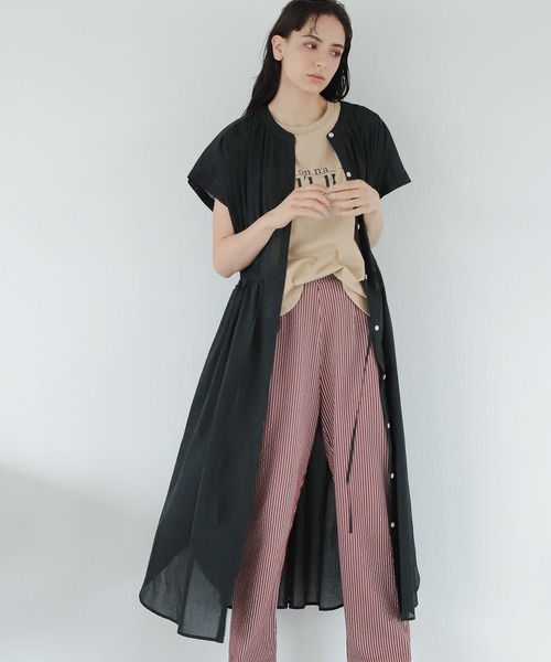 贅沢にとったギャザーと、たっぷりとしたシルエットが魅力のワンピース。ウエストにはドローストリングをプラスし、シルエットを変えてお楽しみいただけます。スリーブレスデザインですが、腕まわりがすっきりキレイに見えるように、肩の開きを細かく調整しています。【素材】コットン100%の透け感のある素材を使用。表情のあるストライプ柄が特徴的です。【スタイリング】パンツとレイヤードにして、ワンピースを主役にしたスタイリングに。また、フロントをオープンにして、ジレのように羽織るのもオススメです。