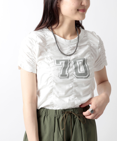 存在感の出るシャーリングデザインとトレンドのナンバリングをしたを施した半袖Tシャツ。シンプルになりがちなTシャツスタイルと気分を変えたい時におすすめ!程よく体に沿うデザインなので、ハイウエストパンツやワイドパンツとの相性が抜群です。シャツやジャケットのインナーにしてコーディネートにメリハリを付けるのも素敵です。※取り扱いについては、商品についている品質表示でご確認ください。※店頭・外での撮影画像は、光の当たり具合で色味が違って見える場合があります。商品の色味は、スタジオ撮影の画像をご参照ください。モデルサイズ:身長:168cm 着用サイズ:フリー本体:洗濯機洗い(弱)