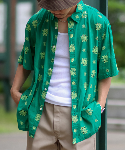 シアー感あるフラワーモチーフの刺繍を施した“こなれ”感がアクセントのシャツが登場。ボディに合わせて配色の刺繍糸を使用することで、インパクト抜群な一着に仕上がっております。濃淡の付く同色を使用した馴染み良いトレンドグリーンと、はっきりとした配色が目を惹くブルーの2色展開。刺繍による透かし部分は風通しも抜群で、単調なコーディネートになりやすい季節のコーディネートの幅が広がる1着です。※取り扱いについては、商品についている品質表示でご確認ください。※店頭・外での撮影画像は、光の当たり具合で色味が違って見える場合があります。商品の色味は、スタジオ撮影の画像をご参照くださいモデルサイズ:身長:178cm 着用サイズ:L本体:手洗い可能