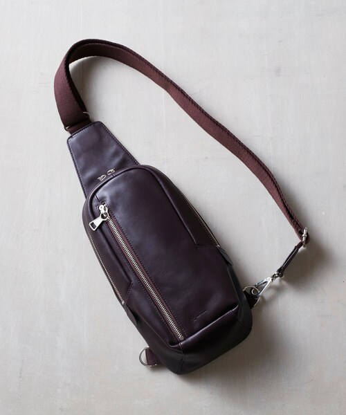 『イタリアンレザーを贅沢に使用』艶感が美しいイタリアンレザーを使用したボディバッグ。無駄がなくシーンやトレンドに左右されないミニマルなルックスは、カジュアルにも綺麗めにもマッチします。コンパクトにまとまっていながらも財布やスマホなどの日常で使う荷物が十分に入るのが魅力です。肩に掛けた状態からでも荷物の取出しがスムーズに行えるワイドな間口も◎ストラップの位置は左右どちらでも付け替えが可能になっています。トレンドのサコッシュバッグがラフ過ぎると感じる方には特におすすめのデザインです。- BRAND CONCEPT -時代を超えて支持されるトラディショナルなアイテムをベースに、アソビ心とストリートの自由な発想を取り入れ、日本独自のミックススタイルを提案します。※ポケット数:外側×1 内側×2店舗へのお問い合わせ商品番号:979-01307●製品寸法:00:高さ32cm 幅(上部)13cm 幅(下部)15cm マチ9cm ショルダー対応サイズ79~137cm 付属チャーム全長13cm 付属チャームH9cm 付属チャームW5.3cm備考:重量:約385g(サンプル重量)