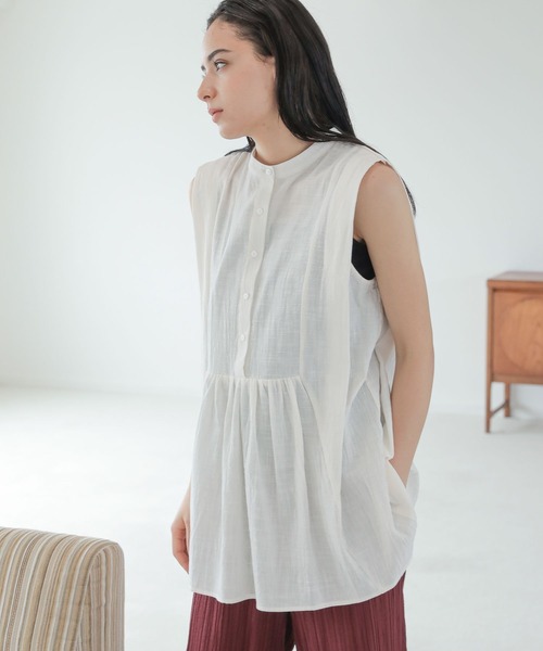 ペプラムデザインのブラウス。 袖部分はスリーブレスながらも、腕がすっきりと見えるデザインに。 ギャザーをほどこし、裾に向かってAラインに広がる立体的なシルエット。 【素材】 コットン100%のスラブ糸を使った生地。 ふんわりとした柔らかさと、肌離れのよさが特徴です。 【スタイリング】 トラウザータイプのパンツと合わせれば、シャープなスタイリングに。 プリントパンツやイージーパンツ、デニムなどのカジュアルボトムスとも好相性です。 同素材のスカートと合わせた、セットアップの着こなしも。 ▼同素材を使用したスカートはこちら コットンスラブティアードスカート ブランド品番:295147 ZOZO商品コード:66887095
