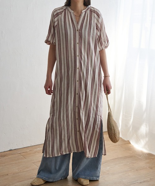 一枚でしっかりサマ見えするストライプ柄ワンピマルチストライプ柄のロング丈ワンピース。ボタンを開けてさらりと羽織るスタイルもおすすめです。【素材】ナチュラルな綿混。凹凸感あるストライプ柄。【デザイン】ノーカラーで、Vネック、さわやかなマルチストライプ柄。袖まわりにボリュームのあるデザインです。【ポイント】夏を感じるロングワンピで、凹凸感のあるストライプ柄がすっきり見せてくれます。深めのスリットでヌケ感があり、パンツとのレイヤードも◎★《お気に入り登録》でお得な情報がいっぱい★・「商品のお気に入り登録」で再入荷通知や、ラスト1点の通知、セール通知も受け取ることができます。・「ブランドのお気に入り登録」で新商品や再入荷など、お得な情報を受け取ることができます!※ご覧のモニター環境により、画像の色味と多少異なる場合がございます。※他のキャンペーンにより、期間中に価格が変動する場合があります。※セールは予告なく終了させていただく場合もあります。