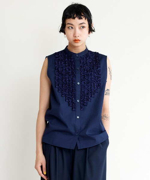 2022SS NEW ARRIVAL シンプルだけど華やかなノースリーブブラウス *こだわりのジャパンクオリティ&メイドインジャパン* フロントにたくさんのフリルをあしらった、取り入れやすい甘すぎないデザインがポイント。 襟元はすっきりとしたノーカラーで、オフィスシーンにも活躍できるくらい上品でクールに仕上げました。 程良くゆったりとしたシルエットで肌に張り付かず、さらりとしたコットン素材なので清涼感溢れる着心地です。 フリルのバランスにこだわり、インでもアウトでもきれいに見える程よい丈感で、 ラフなムードと上品さを兼ね備えた、着るだけでサマになるアイテム。 ------------------------------ 透け感/なし(白はあり) 光沢感/なし 伸縮性/なし 厚 み/普通 ------------------------------ 取り入れるだけで存在感が出るノイズメーカーのお洋服は、休日のお出かけだけでなく、結婚式の二次会やパーティーシーン、セレモニーなどのコーディネートにもマッチするアイテム。 また、モードなアイテムだからこそあえてリュックやサコッシュ、バケットハットやキャップと小物を合わせてカジュアルダウンする着こなしもカワイイです。 スニーカーやデニム、チノパン、アーミー等を合わせることでストリートモードに、サンダルやスクエアトゥ、ブーツを合わせることでモードに、いろんなスタイルを可能にする洋服です。 NOISE MAKER(ノイズメーカー) 素材の良さはもちろん、パーツひとつひとつに丁寧な工程を施し、立体的で着心地の良い1着を作ることをモットーにしています。デザインのみならず、袖を通した瞬間の心地よさを大事にしているブランドです。 *お買い物をお楽しみいただくために* ▼商品のお気に入り登録 カートボタン付近の♡をクリックして商品をお気に入り登録をすると、完売カラーの再入荷通知や、ラスト1点の通知、セールの通知などを受け取ることができます。 ▼ブランドのお気に入り登録 「♡ブランド追加」または「♡このブランドをお気に入り登録」をクリックすると、新商品や再入荷等最新情報を受け取ることができます。
