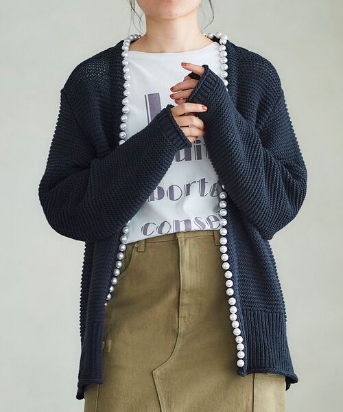 【人気アイテムがさらにアップデート!】 秋冬で人気だったパールカーディガンが春バージョンで登場。 羽織るだけでおしゃれを叶えてくれる華やかニットカーディガン。 ネックをスッキリとしたややVネックラインに変更し、軽やかさを出しました。 袖口と裾にはロールデザインのアレンジも加えてよりこなれた雰囲気に。 パールは1点1点ハンドメイドで仕上げており、価値観のあるニットになっています。 コーデのバランスを取りやすいように着丈や袖丈などサイズ感にもこだわりました。 カジュアルにデニムやカットソーとのコーデやブラウスでフェミニンに仕上げるのもおすすめです。 ==================== 透け感:ややあり 伸縮性:あり 光沢感:なし 生地の厚さ:やや厚手 ====================