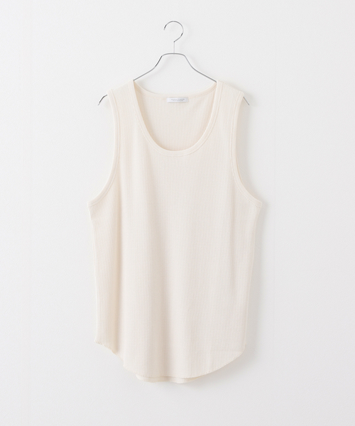 コットンポリのタンクトップ。 生地はワッフル地になっており、凹凸感のある素材。 インナー使いやレイヤード使いに最適です。 ********************** 裏地:なし 伸縮性:あり 光沢感:なし 生地の厚さ:普通 ********************** モデルサイズ:身長:179cm 着用サイズ:XL 本体:洗濯機洗い(弱)