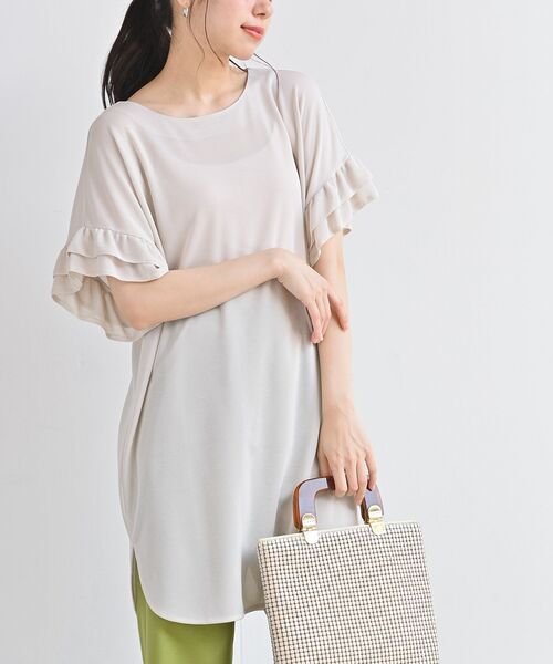 着るだけで女性らしい袖フリルチュニック 袖のダブルフリルで女っぽく決まるシアーチュニック。 ボリューミーなデザインで二の腕の華奢見えも叶えてくれます。 編み目の粗いメッシュ地のようなカットソーで仕立てた爽やかな1枚。 ほんのりシアー感もあり涼しげな印象を与えます。 お腹やお尻周りを隠してくれるチュニック丈。 薄手なのでウエストインしてももたつかずスタイリングがきれいにまとまります。 横に広がるラウンドネックが女性らしいデコルテラインに♪ 裏地なし 伸縮性あり 薄手 洗濯:手洗い可