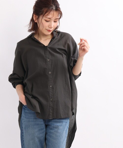 【デザイン】 シアー感が特徴のふわっとした肌触り良いタッチに仕上げたコットンシフォンで仕立てたオーバーサイズシャツ。 裾は前後差をつけ、タックイン・アウトでも決まるようにしています。 後ろタックでヒップ周りも隠れ、ゆったりしたゆとりのあるシルエット。 前を閉じても、開けて羽織りとしてもリラックスして着ていただけます。 レイヤードしやすく、春先~盛夏まで長く活躍するアイテムです。 【生地感】 ふんわりとした落ち感のソフトな風合いが魅力のコットンシフォン素材を使用しています。 ※こちらの商品は透け感があるため、インナーの着用をおすすめします。 モデル情報:身長167cm B78 W62 H88 着用サイズ:00(FREE) 店舗へのお問い合わせ商品番号:C62-84027 ●製品寸法: 00(FREE):着丈84cm B138cm 袖丈37cm 肩幅71cm 備考: