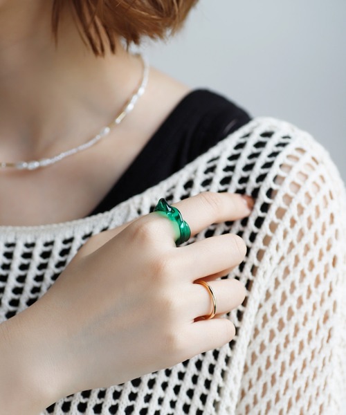 瑞々しいボリューム感のあるフォルムが、コーディネートに涼しげな印象を与えるガラスリング。指先にひとつカラーアイテムを取り入れるだけで、ぐっと印象的な手元に。単品使いはもちろん、お手持ちのメタルリングとのレイヤードにもおすすめです。※ATTENTION※■製造・輸送時についた微細なキズや、黒点、気泡・内包物、欠けが見られる場合がございます。■色合いやサイズ、形状には個体差がございます。上記は不良の対象外となりますので、予めご了承くださいませ。