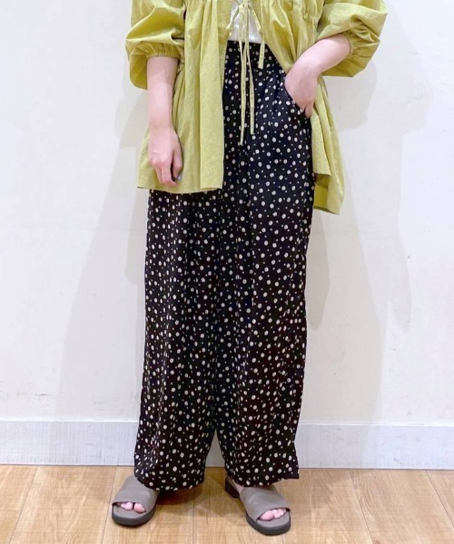 ーーーサラッとした肌触りの素材を使用したゆったりとしたシルエットのイージーパンツ。ウエストはゴム紐で調節可能のイージー仕様に。ヒップ回りはゆったりとさせ、裾にかけて細くした少し丸みのあるシルエット。接触冷感や吸水速乾、イージーケア(洗濯後のしわになりにくい)、紫外線防止、マシーンウォッシャブルなど多機能付き。ーーーオリジナルのプリントが印象的な主役パンツなので、シンプルなTシャツやシャツ合わせがおすすめです。