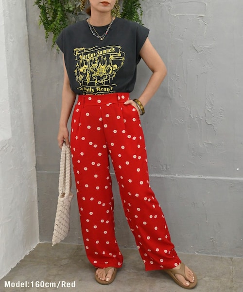 商品名:Sheson(シーズン)デイジーフラワーストレートパンツ 商品番号:220601-19 商品説明:【2022SS】 【単品でメール便送料無料】 デイジー柄が可愛いトレンドのカラーパンツ 程よい太さのストレートで脚のラインが出にくく、脚を綺麗に見せてくれます。 小ぶりな柄なのでロゴTなどデザイン性のあるトップスとも合わせやすい! サラッとした生地で着心地が良く、バックはウエストゴム仕様で着脱も楽ちん◎ **ご注意** *こちらは単品の場合はメール便配送となり日時指定はお受けできません。 2点以上で宅配便となり、3,980円以上は送料無料(沖縄・離島除く)です。 離島は1,210円、沖縄は1,430円の配送料が掛かって参りますのでご注意ください。(メール便は一律280円です) *コンパクトな配送となる為商品にシワが付く場合がありますがスチーム等で簡単にお取り頂けます。 *商品画像のお色は撮影環境やモニターによって、 実物と若干異なる場合がございます。 *他のサイトと在庫を共有している為、ご注文頂いた商品が欠品となる場合もございます。 ------------------------------------------------------------------------- サイズ:Fサイズ(モデル160cm-RED/165cm-GRN/169cm-BLK) ・ウエスト 34~45cm ・ヒップ 56cm ・股下66cm ・総丈 97cm ※個体によって若干異なる場合がございます。 **生地詳細** 【裏地】なし【生地の伸縮】なし【生地の透け感】なし **洗濯表示** 弱で洗濯可 素材:ポリエステル100% 製造:韓国 カラー:レッド・グリーン・ブラック