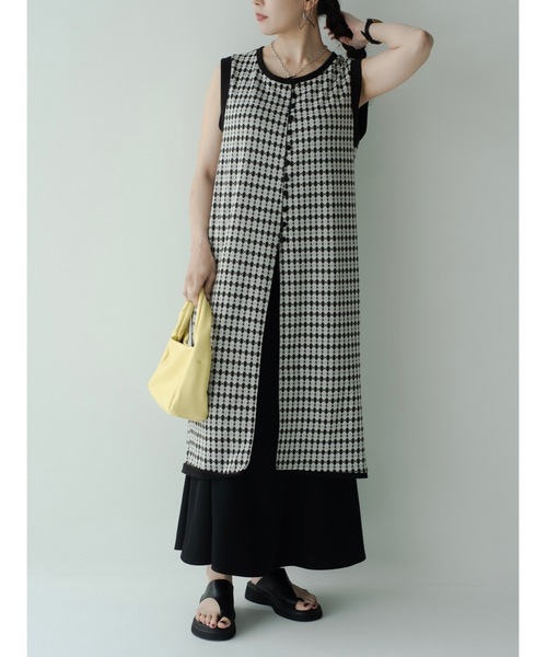 ジャガード編みのロングニットワンピース。 ベストのように重ねて着用いただくアイテムで、 ワンピースやパンツなど、 普段のコーディネートに合わせるだけで、 お洒落見えが叶います。 ブラックのパイピングとボタンが、 全体を引き締めて見せてくれるデザインです♩ ※素材が繊細な為、ハンガーにかけると伸びる可能性がございます。 ハンガーにかけず、畳んでの保管をお願いいたします。 ・・・・・・・・・・・・・・・・・・・・・・・・・・・・・・・・・・・・・・・・・・・・・・・ ◆アイテム詳細 素材・・ポリエステル97% ポリウレタン3% 透け感・・・なし 生地の厚さ・・・普通 伸縮性・・・あり 裏地・・・なし ・・・・・・・・・・・・・・・・・・・・・・・・・・・・・・・・・・・・・・・・・・・・・・・ ◆サイズ感 普段Mサイズを着用されている方でふくらはぎの中間くらいの丈感、 Sサイズを着用されている方で足首がしっかり見えるくらいの丈感です。 ◆スタイリング キャミソールやタンクトップをインナーにして、ノースリーブで着るのが涼しげで◎ 肌寒い季節には、セカンドスキンのアイテムを合わせるのも可愛いです。 ボトムスには、柄の少ないスカートやパンツを合わせると バランスが取りやすくおすすめです♩