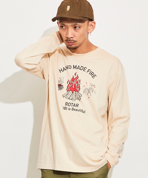 焚火をイメージしたHAND MADE FIREのグラフィックロンTee。 火打石で火を起こす手間のかかる着火方法をイメージし、小さな種火からほぐした麻に移し更に大きな火にしていくという苦労を惜しまない楽しさが表現されています。 大変な物事ほど終わったときの喜びも大きいというどこか人生にも例えられたさり気ないメッセージが秘められています。 小さなことからコツコツと、日々忘れがちですが大切にしたいですよね。 BODYには、ベーシックなサイズとシルエットで安定感があり、伸びにくい首元と、ハリと強度のある生地感が特徴の5.6ozセミコーマのクルーネックを採用。 袖口はリブ仕様で、ロンT独特の野暮ったさを解消しています。レギュラーなボックスのサイズ感なので年間で使いやすく、1枚で着たりインナー使いとしても活躍できるアイテムです。